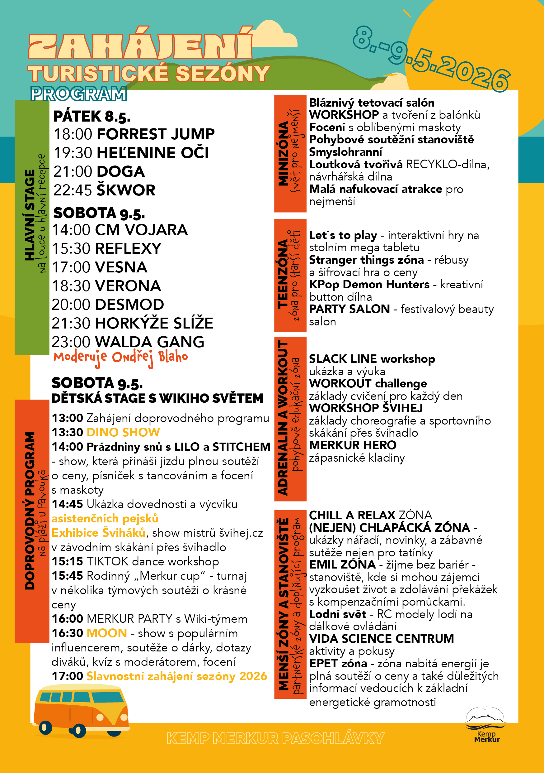 Zveme Tebe i celou Tvoji partu nebo rodinu na tradiční start sezóny v Kempu Merkur v Pasohlávkách – víkend plný hudby, pohody a festivalové atmosféry u lagun na břehu Novomlýnské nádrže.